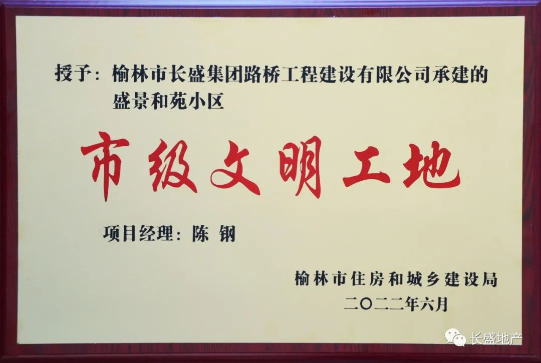 近日,從榆林市住房和城鄉(xiāng)建設(shè)局傳來喜訊,榆林市長盛集團房地產(chǎn)開發(fā)有限公司盛景和苑項目被授予2022年度“市級文明工地”榮譽稱號。