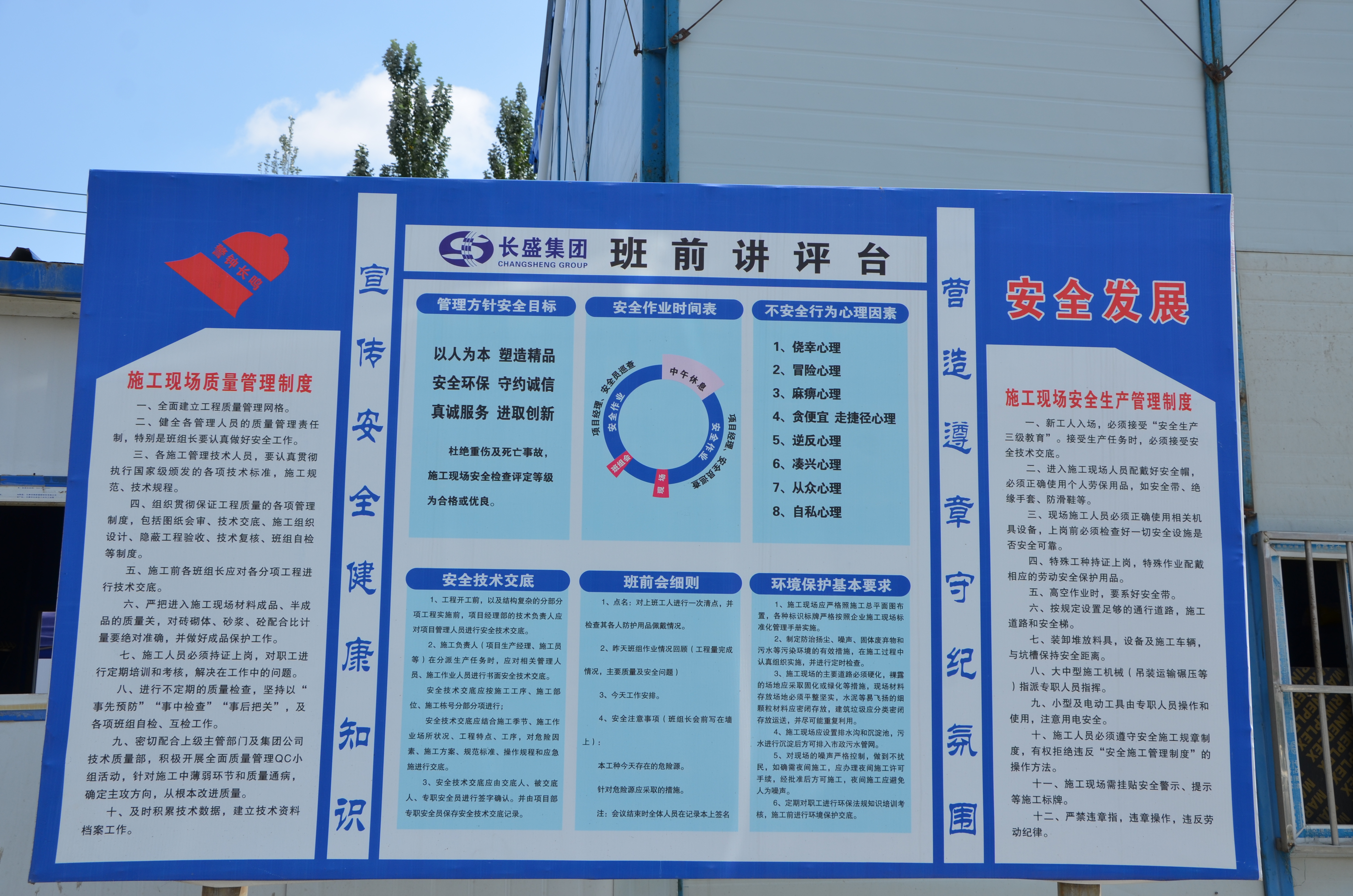 走進(jìn)項(xiàng)目施工現(xiàn)場(chǎng),小編顛覆了對(duì)建筑工地的認(rèn)識(shí),整潔有序的施工現(xiàn)場(chǎng),四處可見(jiàn)張貼整齊的安全警示標(biāo)識(shí),可見(jiàn)長(zhǎng)盛地產(chǎn)公司對(duì)項(xiàng)目安全管理的重視程度。