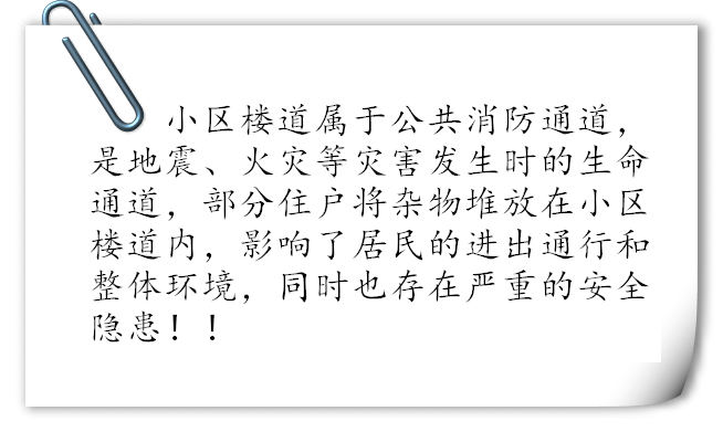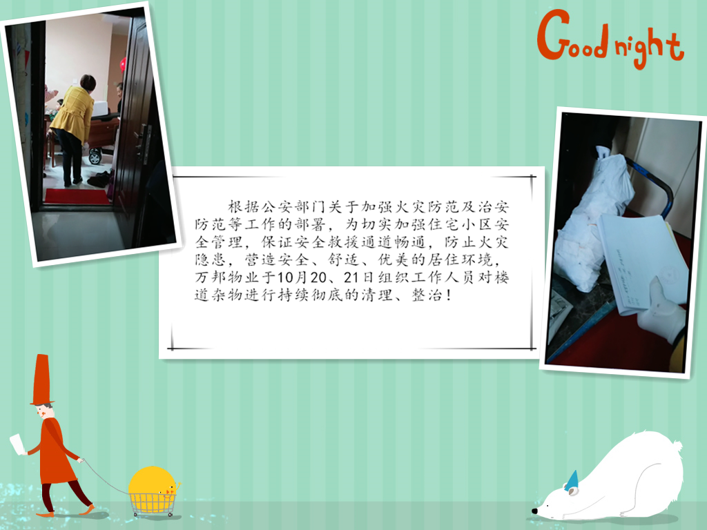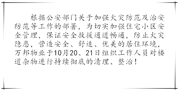 根據(jù)公安部門關(guān)于加強(qiáng)火災(zāi)防范及治安防范等工作的部署,為給業(yè)主創(chuàng)造一個(gè)優(yōu)美、舒適、安全的居住環(huán)境。我物業(yè)公司一直堅(jiān)持不懈的做著此工作,本月針對(duì)長(zhǎng)期占用公共區(qū)域堆放雜物的業(yè)戶進(jìn)行統(tǒng)一上門清理,并向業(yè)主傳達(dá)相關(guān)消防法律知識(shí)。