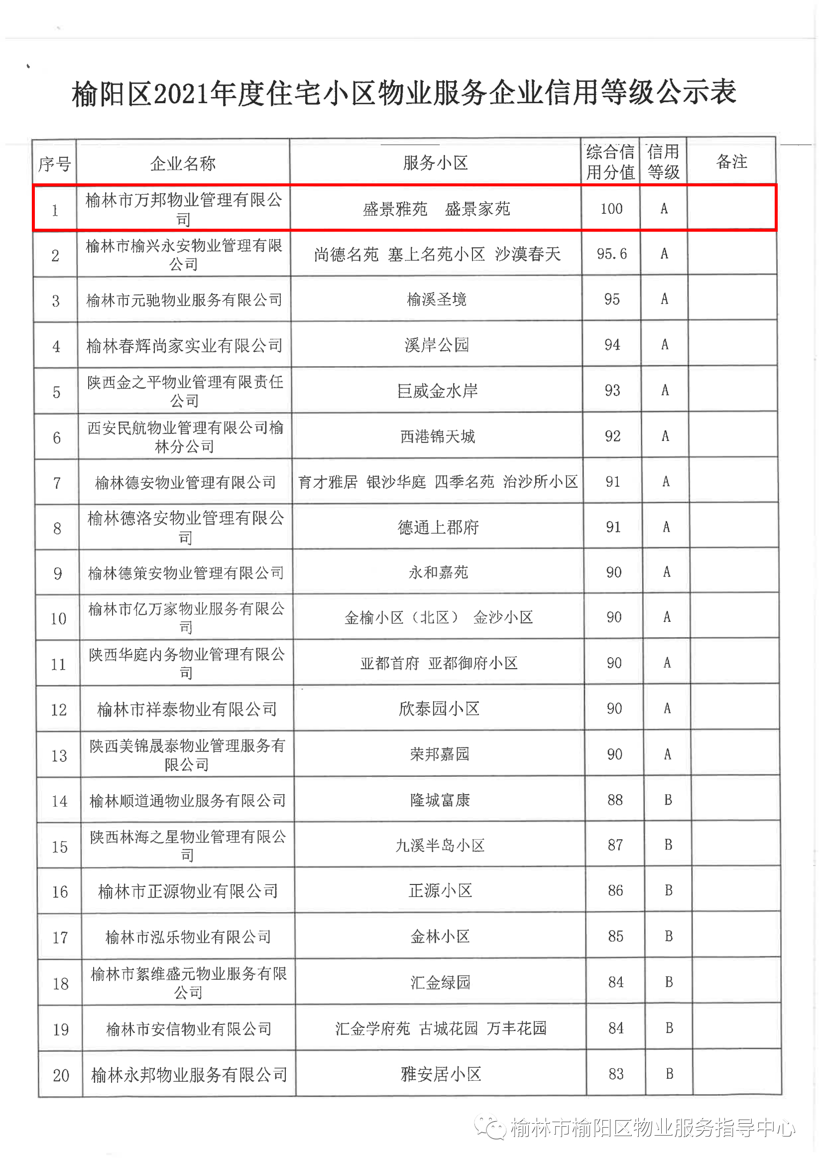 喜報(bào)!萬邦物業(yè)位居榆陽區(qū)2021年度住宅小區(qū)物業(yè)服務(wù)企業(yè)信用等級(jí)首位