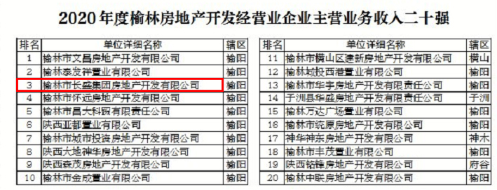 在公布的2020年度榆林房地產(chǎn)開(kāi)發(fā)經(jīng)營(yíng)業(yè)企業(yè)主營(yíng)業(yè)務(wù)收入二十強(qiáng)名單中,榆林市長(zhǎng)盛集團(tuán)房地產(chǎn)開(kāi)發(fā)有限公司排第3名。